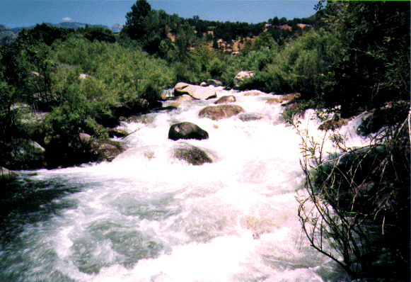 This section is the Classic Kaweah run. The description starts at the traditional historical Put in at Pumpkin Hollow Bridge even though the put in at the bridge has been blocked of in the spring of 1994. Put in below Headwall where the highway comes adjacent to the river. It's best to run this section with someone familiar with the run as some drops are hard to scout and the river splits in several places. The route is usually to the leftmost channel. This section is still runnable below zero on the gauge (less than 400 cfs) although it becomes quite technical and more rocks are visible than water.